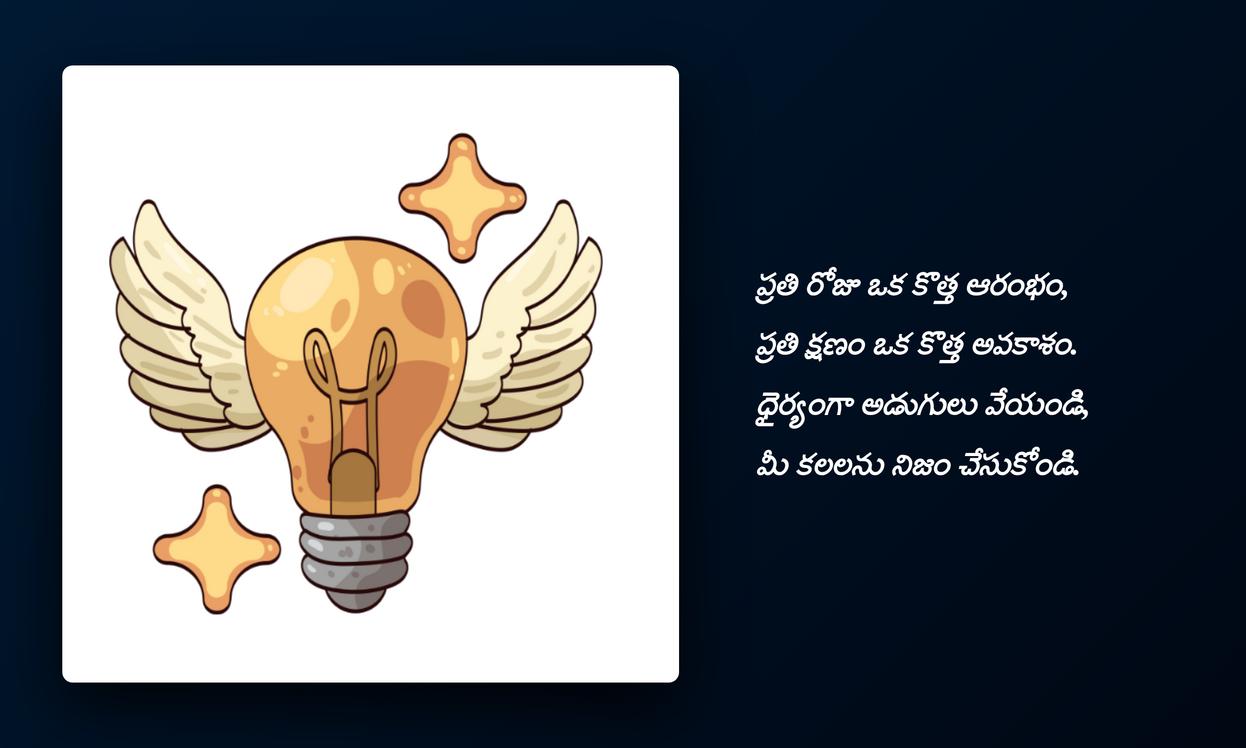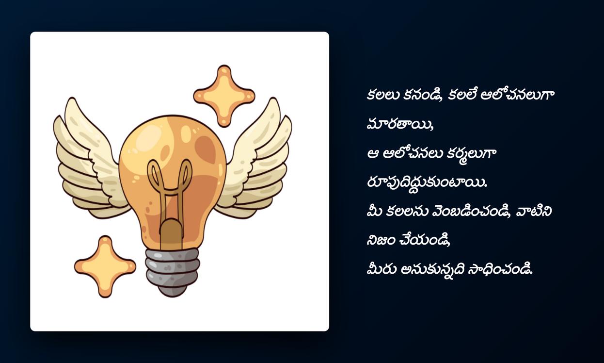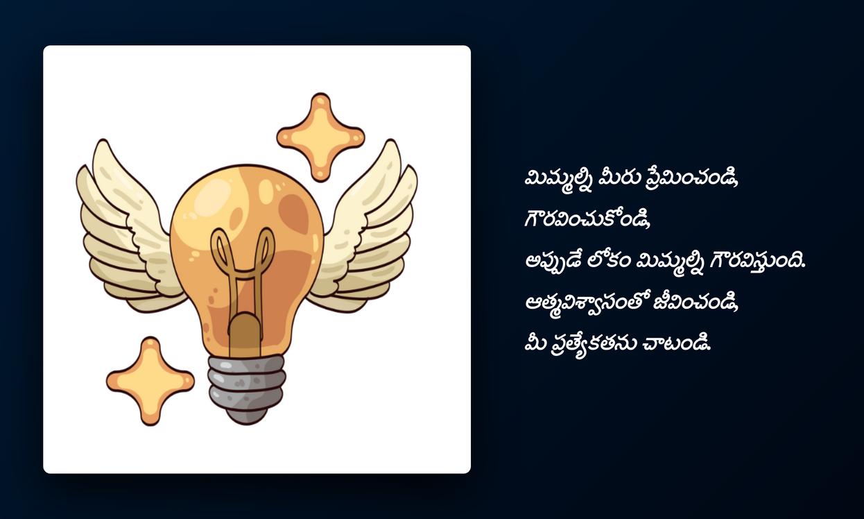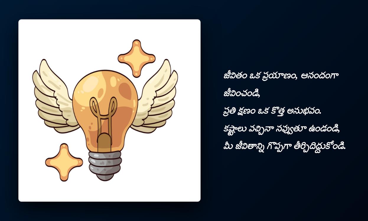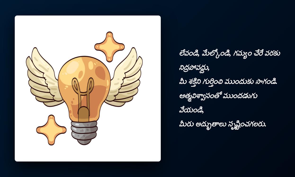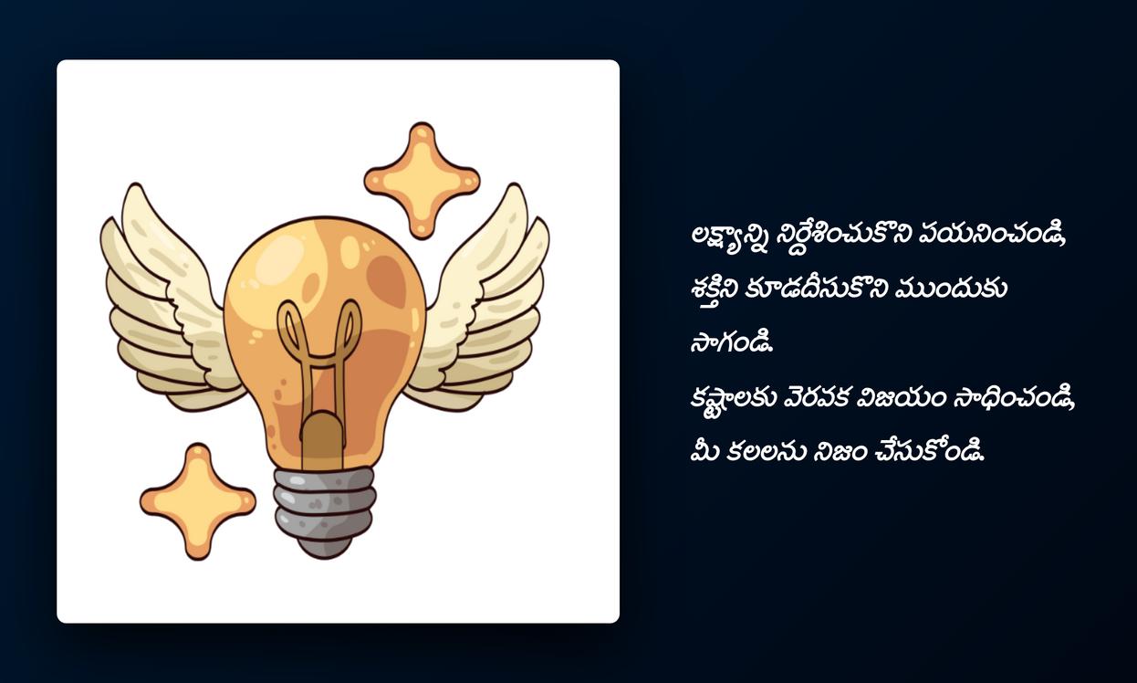 inspirational quotes in telugu:ముగింపుగా చెప్పాలంటే, జీవితంలో ఎన్నో ఎత్తుపల్లాలు ఉంటాయి. అలాంటి సమయాల్లో మనకు మానసిక స్థైర్యాన్ని, ముందుకు సాగే స్ఫూర్తిని అందించే అద్భుతమైన సాధనం inspirational quotes. ఈ కోట్స్ కేవలం పదాలు కావు, అవి మన ఆత్మవిశ్వాసాన్ని పెంచే శక్తులు. ప్రతిరోజూ మనం చూసే, చదివే ఒక పాజిటివ్ కోట్ మన ఆలోచనలను ప్రభావితం చేస్తుంది, మనలో ఆశను రేకెత్తిస్తుంది. ఒక కొత్త దినాన్ని ఉత్సాహంగా ప్రారంభించడానికి, మన లక్ష్యాలను చేరుకోవడానికి ఇవి తోడ్పడతాయి.