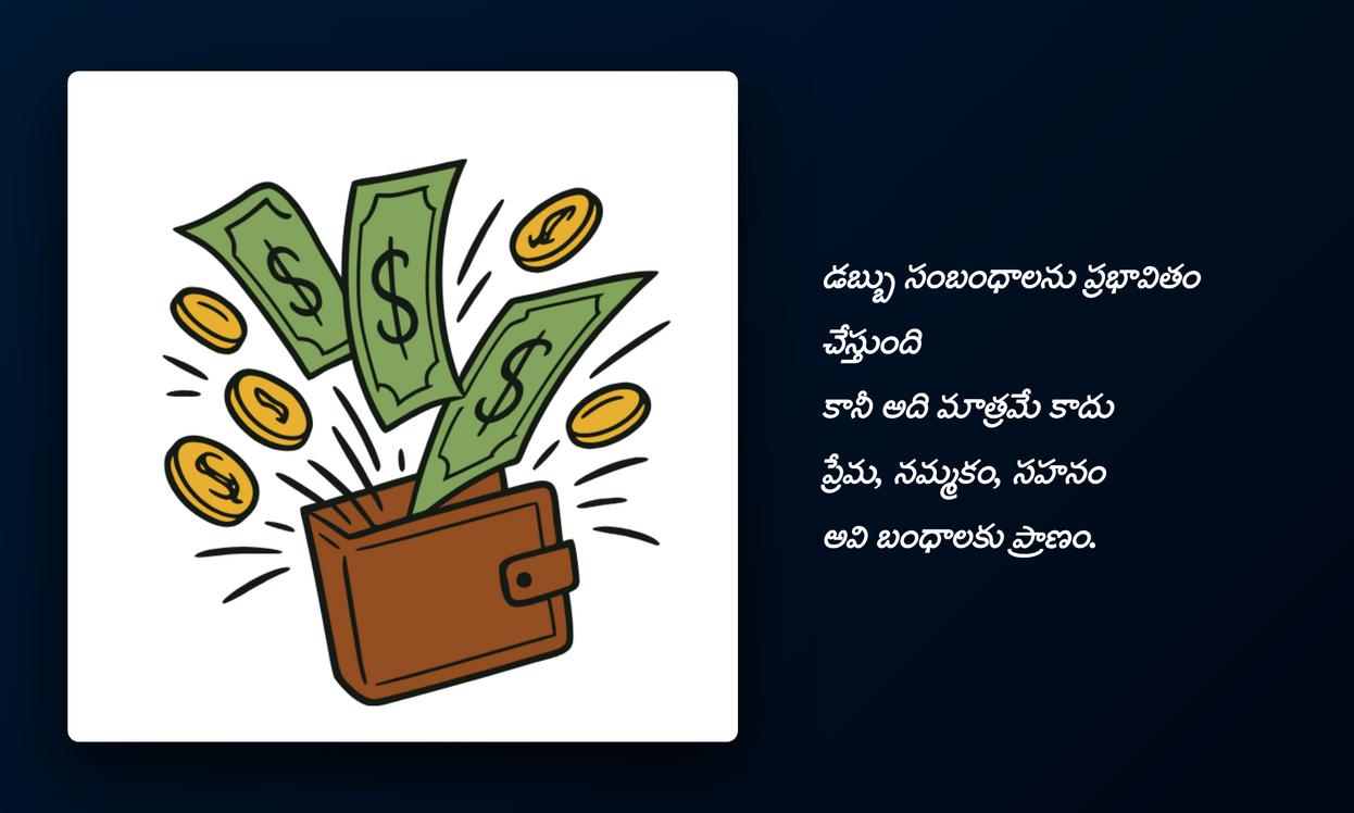 ఆర్థిక విషయాలపై మన ఆలోచనలను, ఆశలను, లేదా కష్టాలను పంచుకోవడానికి money quotes in Telugu ఒక అద్భుతమైన మార్గం. ఈ కోట్స్ మీ social media identity ని బలంగా చూపిస్తాయి, మీ feelings ను స్పష్టంగా కమ్యూనికేట్ చేస్తాయి. ఇవి మన ఆలోచనలను ప్రతిబింబించడమే కాకుండా, మన స్నేహితులకు, కుటుంబ సభ్యులకు కూడా స్ఫూర్తినిస్తాయి. డబ్బు గురించి మీ వ్యక్తిగత అభిప్రాయాలను, లక్ష్యాలను వ్యక్తపరచడానికి ఈ కోట్స్ ఎంతగానో తోడ్పడతాయి.