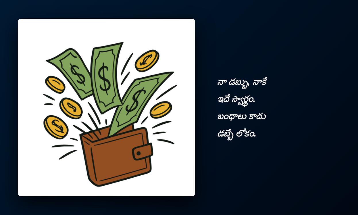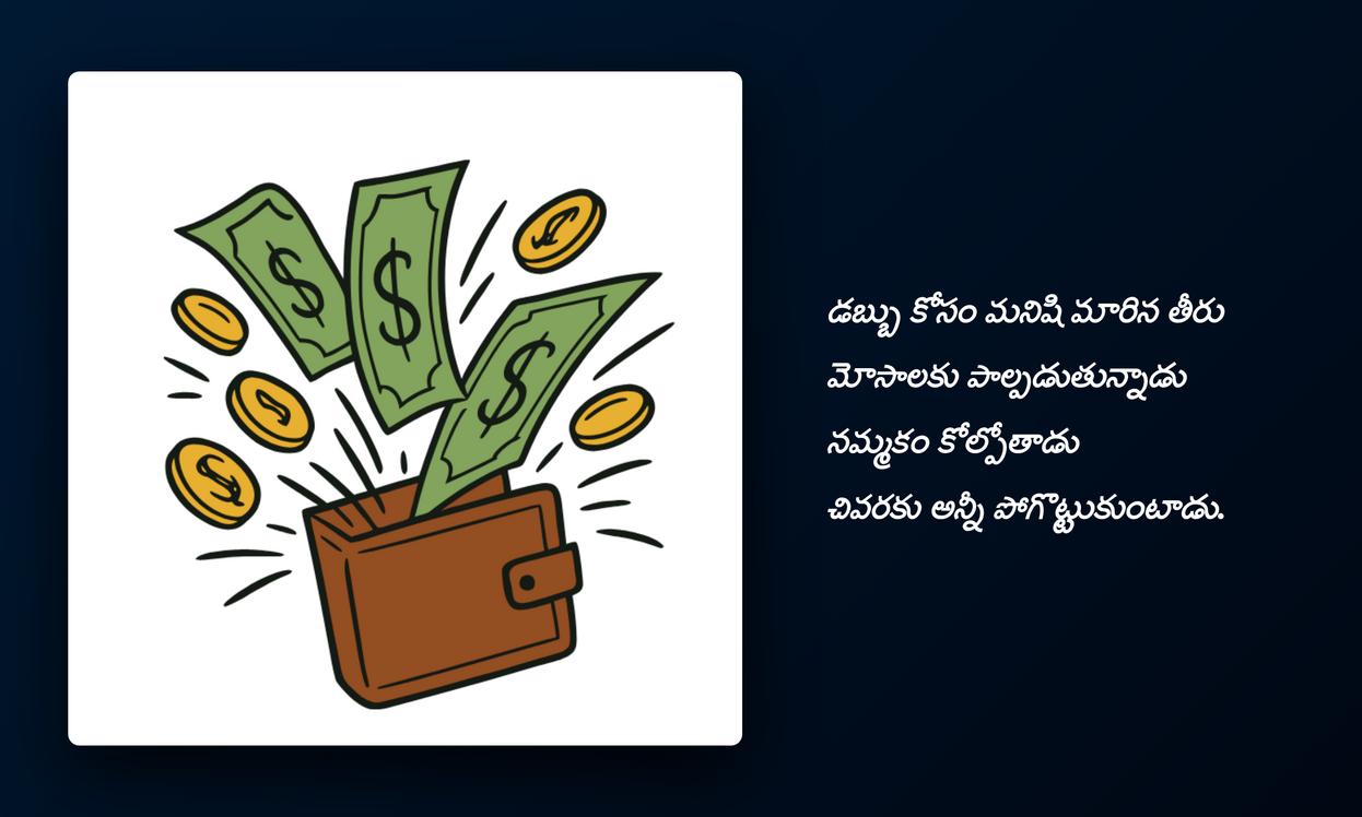 money quotes in telugu:డబ్బు అనేది మన జీవితంలో ఒక ముఖ్యమైన భాగం, అది మన భావోద్వేగాలను, నిర్ణయాలను ఎంతగానో ప్రభావితం చేస్తుంది. మనందరికీ డబ్బుతో ఒక విభిన్నమైన సంబంధం ఉంటుంది – అది ఆశను, ఆనందాన్ని, లేదా ఆందోళనను కలిగించవచ్చు. మన రోజువారీ జీవితంలో Money ఒక కీలక పాత్ర పోషిస్తుంది. దాని గురించి మన ఫీలింగ్స్, మన దృక్పథం ఏమిటో తెలియజేయడానికి inspiring quotes ఎంతో ఉపయోగపడతాయి. మీ WhatsApp DP లేదా social media status గా పెట్టుకోవడానికి ఈ కోట్స్ సరైన ఎంపిక. అవి మీ profile కు ఒక ప్రత్యేకతను ఇస్తాయి.