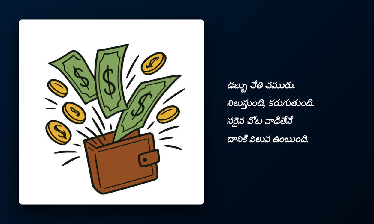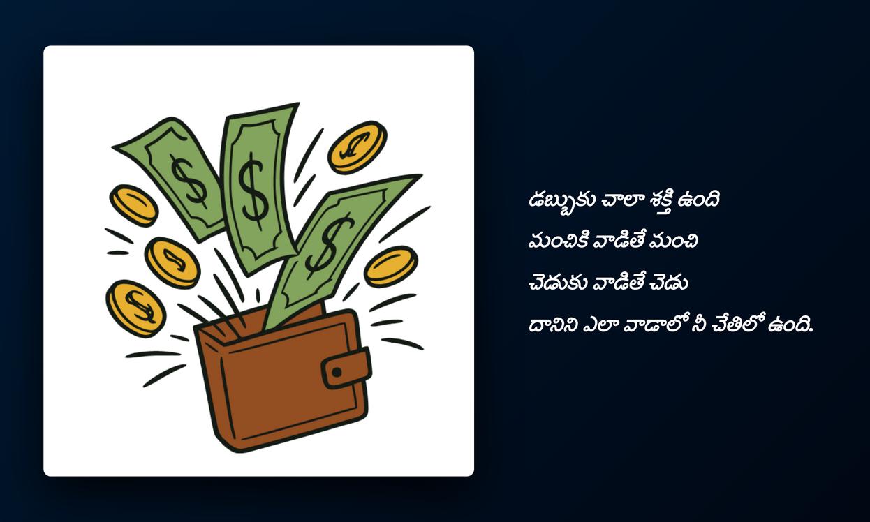 money quotes in telugu:డబ్బుకు సంబంధించిన ఆలోచనలను వ్యక్తీకరించడానికి, మన financial journey లో సరైన మార్గాన్ని చూపించడానికి money quotes చాలా విలువైనవి. ఈ కోట్స్ కేవలం inspirational పదాలు మాత్రమే కాదు, అవి మన ఆర్థిక లక్ష్యాలను గుర్తుచేసే reminders. ప్రతి quote మనలో డబ్బు పట్ల అవగాహనను పెంచుతుంది, దానిని సంపాదించడం, నిర్వహించడం గురించి నేర్పుతుంది. మీ social media profile లో ఈ quotes మీ financial wisdom ను పంచుకోవడానికి చక్కని మార్గం.